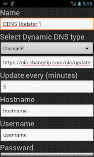 - For every dynamic DNS updater set the name, timeout (in minutes), hostname, username, password and whether to update with the local or public IP address, start the Dynamic DNS Updater when connected to a specific WIFI network, update on connectivity change, start on boot